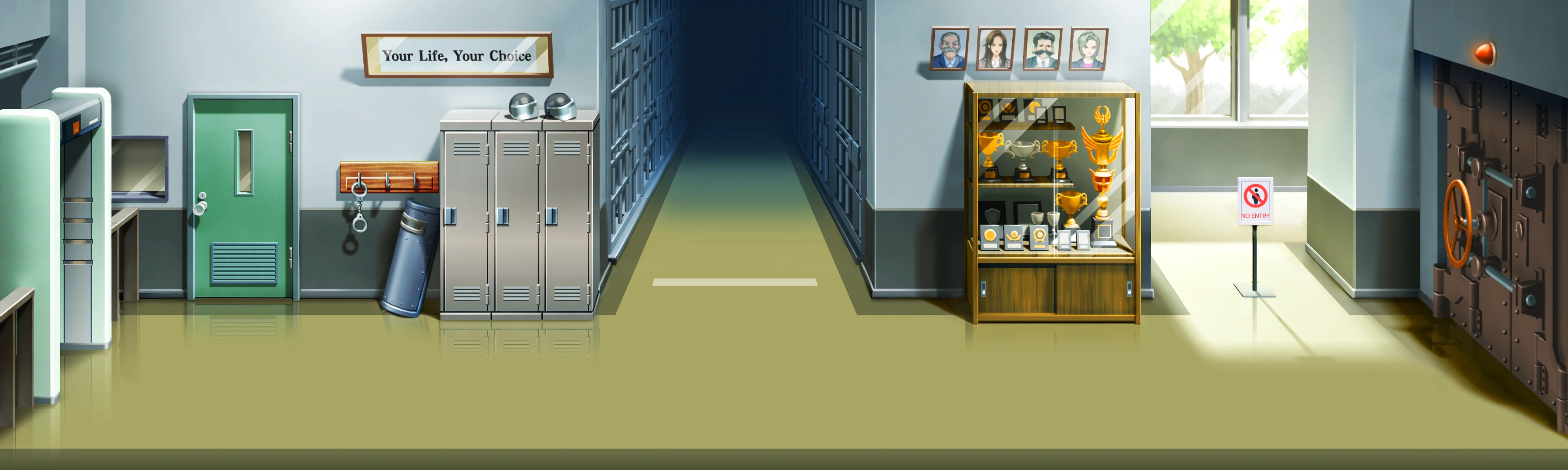 The doorway leading to the prison and the doorway leading elsewhere in the detention center have security gates. This means that the passage of people through this area is heavily secured, though packages undergo a simpler check and items could be smuggled through this method. Throughout the corridor are lockers for the guards. The corridor also contains a trophy display case. Above it are framed profile photos of four people. There is a sign near the door to the monitoring room that reads "Your Life, Your Choice".[1]