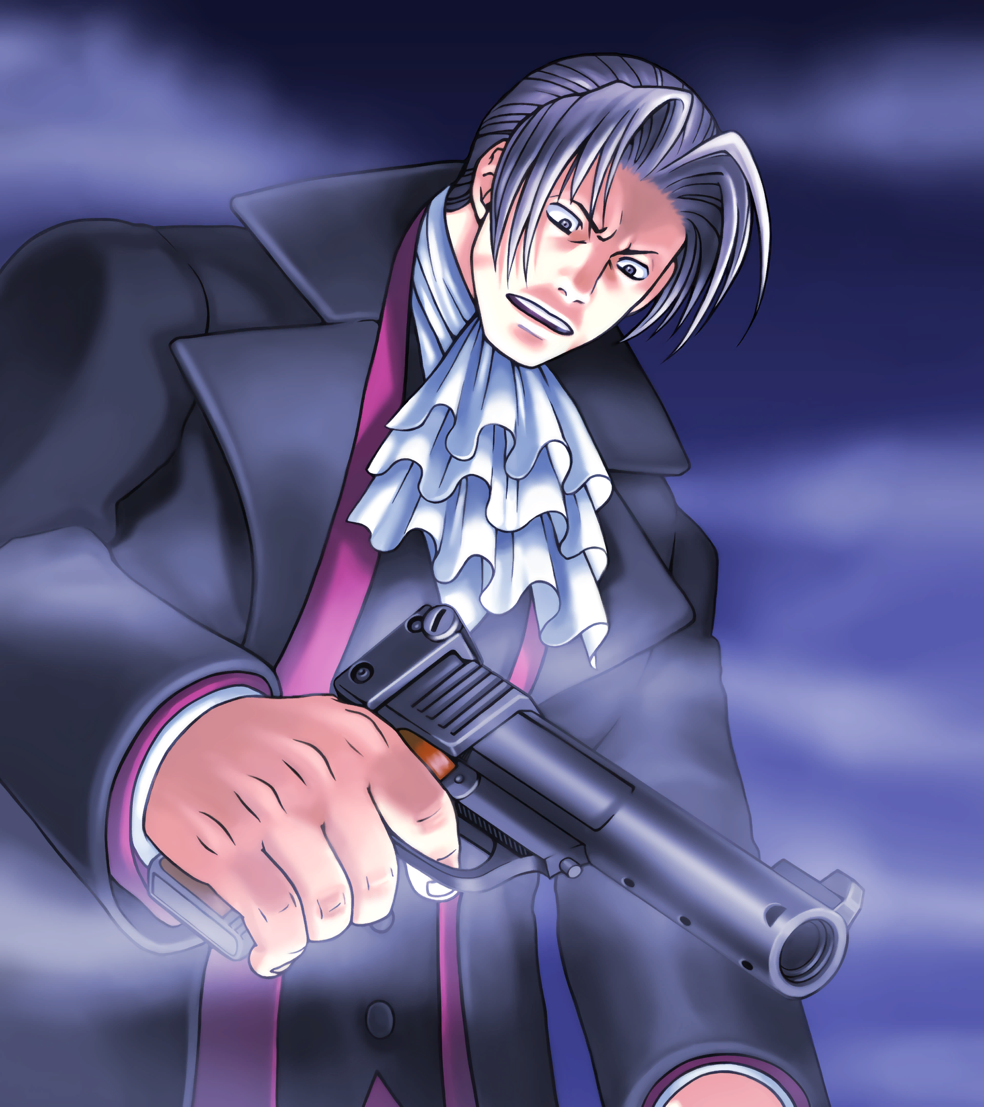 The younger Miles has a slightly fancier suit, with a blue and gold waistcoat, black cuffs on the sleeves, and gold decals on the lapels. It bears a strong resemblance to Manfred von Karma's suit design. Miles would also mimic several of Manfred's gestures such as folding his arms and wagging his finger back and forth in a similar condescending manner. In later eras, this suit can be seen framed in his office during Rise From The Ashes and Turnabout Visitor, in which he mentions that it was a gift from his late mentor Manfred von Karma.