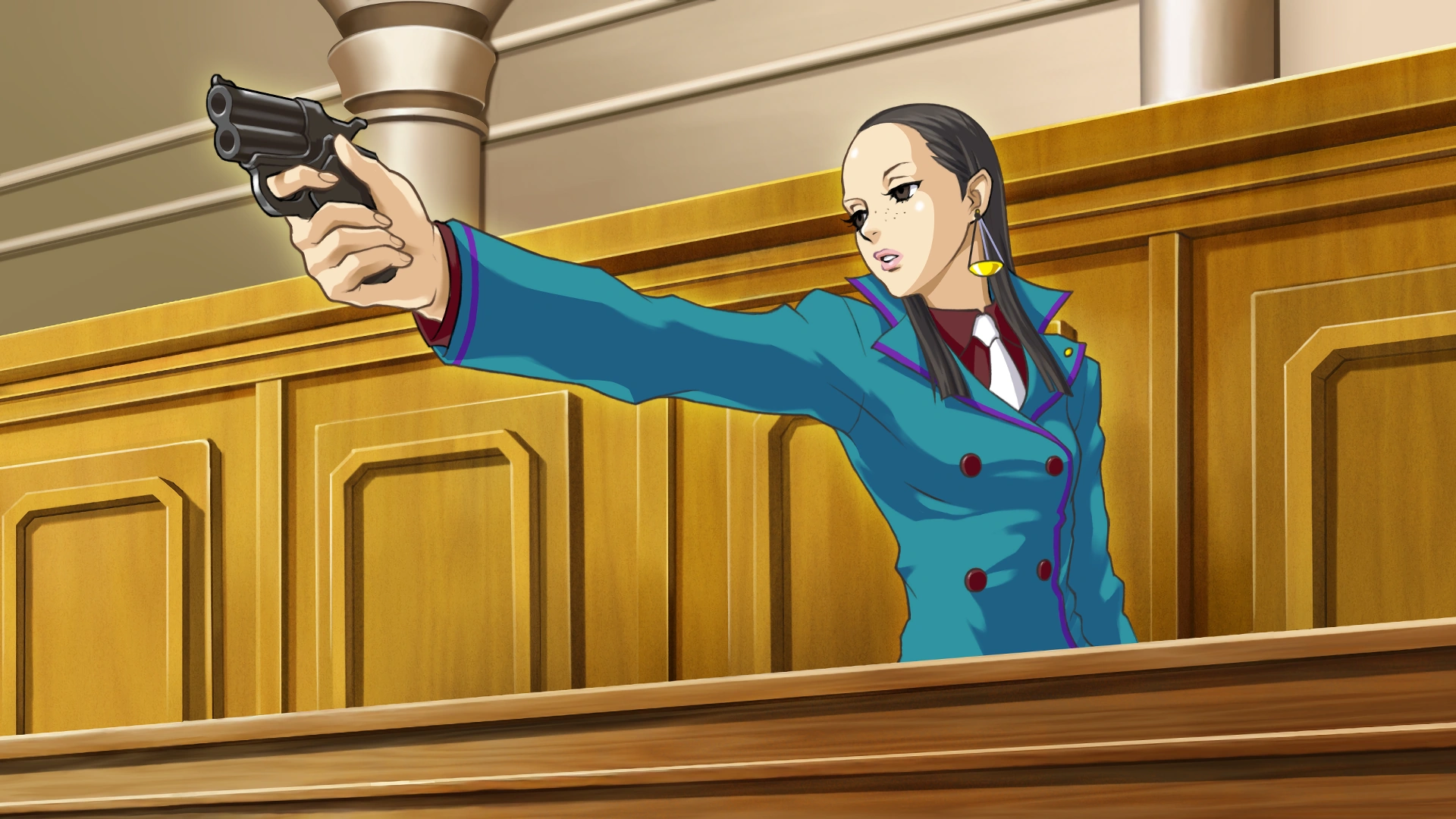 Later investigations brought Edgeworth into Courtroom No. 3, facing Calisto in another argument. He implicated Calisto as the real killer and revealed the truth behind her role at the courthouse. Calisto asked for the murder weapon, which had been dubbed the Yatagarasu's Key, to verify its transformation into a knife, which was a key point in Edgeworth's argument. As Edgeworth realized that Calisto was the Yatagarasu, she gave a long laugh and thanked him for giving her a thrill that even her heists couldn't give her. She admitted to everything, including her role as a member of the smuggling ring. She pulled a gun on Edgeworth and shot at him, although he was able to dodge it, before proceeding to escape from the courtroom.