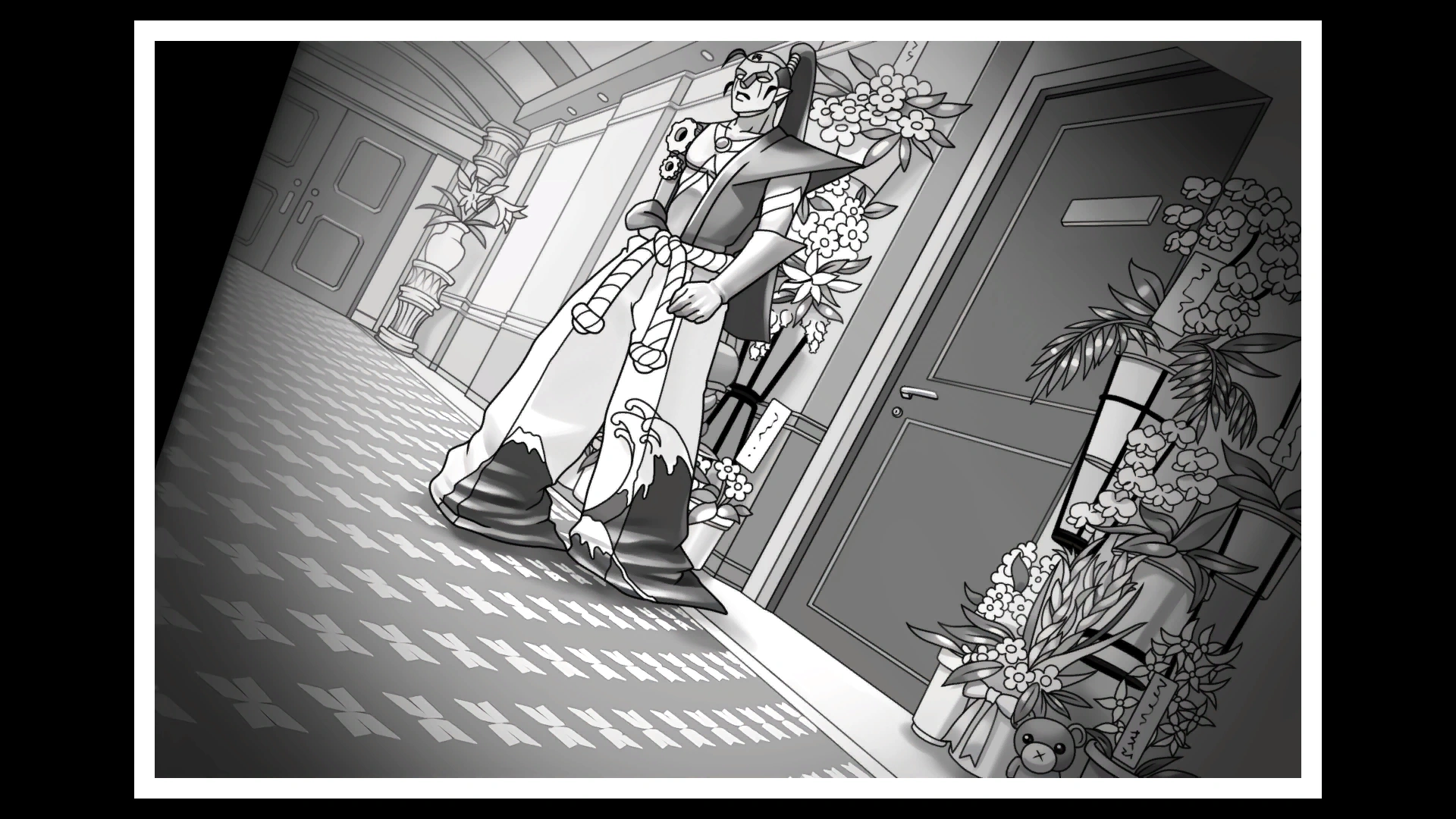 Wright received a call from Gumshoe, telling him to return to the office immediately. Once there, Gumshoe told Wright that, by tracking down the buyer of the stuffed bear, they had found that the person who had planted the spy camera in Corrida's room was none other than Matt Engarde. This shocked Wright to the point where, for the first time, he found himself questioning his client's innocence, and he decided to confront Engarde once and for all.